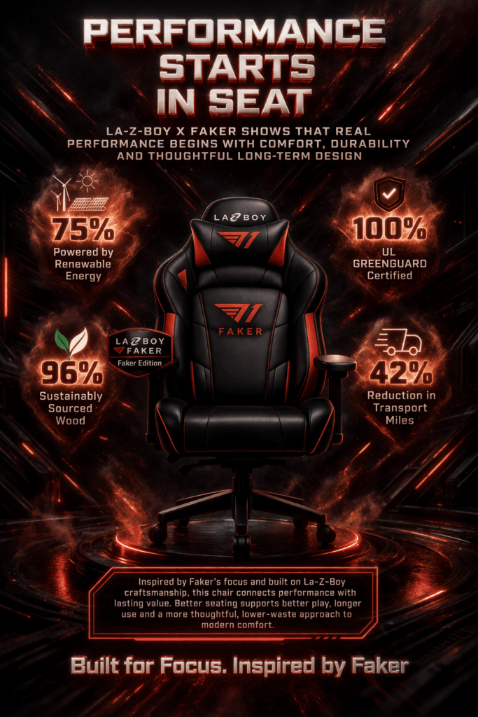 This infographic supports the La-Z-Boy x Faker campaign by showing that performance is not only about what happens on the screen, but also about the comfort and quality behind the setup. Faker adds relevance, discipline and esports credibility to the collaboration, while La-Z-Boy’s sustainability data gives the message substance. By highlighting renewable energy use, sustainable wood sourcing, certification standards and reduced transport miles, the infographic positions the chair as both premium and responsible. Strategically, this helps younger audiences see the product as a smarter long-term seating choice rather than only a stylish gaming accessory.